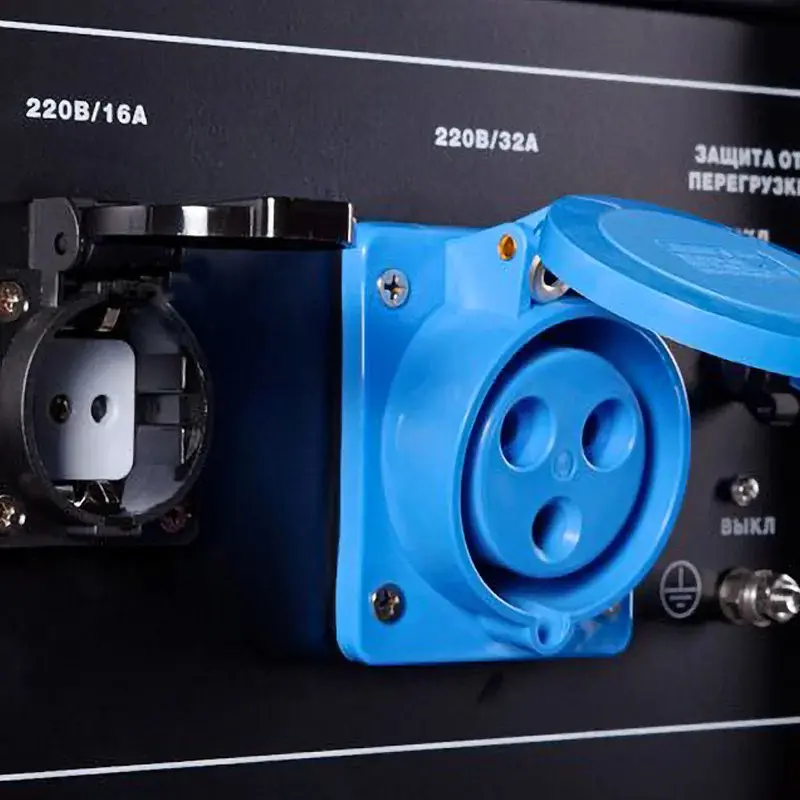 Для подключения техники на корпусе есть 2 розетки: одна на 16 А, а другая силовая на 32 А. Каждый выход имеет защитную пластиковую крышку, которая надежно закрывается. Благодаря этому грязь и капли воды не попадут на важные элементы даже если бензиновый электрогенератор установлен в запыленном помещении или в месте с повышенной влажностью.