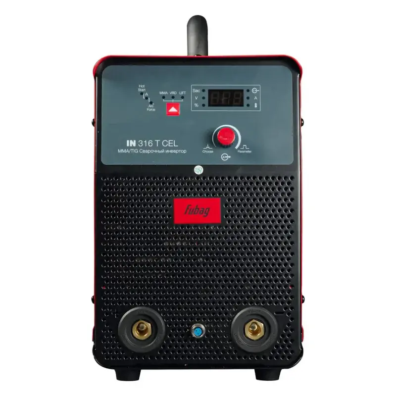 Сварочный инвертор Fubag IN 316 T CEL профессионального класса с потребляемой мощностью 8,5 кВт работает от электросети с напряжением 380 В. Аппарат предназначен для ручной электродуговой сварки покрытыми электродами диаметром до 6 мм. Возможность точной настройки всех этапов процесса позволяет выполнять качественные сварные швы. Модель поддерживает два вида сварки — MMA и TIG с поджигом дуги, а также режим пониженного напряжения холостого хода. Надежное соединение через байонетные разъемы на лицевой панели исключает потерю тока и нагрев в местах контакта. Алюминиевая ручка с нескользящей накладкой обеспечивает удобство переноски сварочного аппарата.