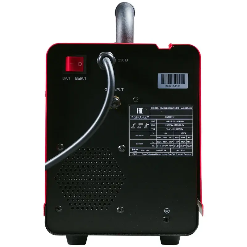 Технические характеристики, подробные указания по настройке и подключению наглядно обозначены на корпусе. Встроенная лампа подсвечивает отсек, в котором находится механизм протяжки, для удобства заправки проволоки. Смена полярности выполняется легко и быстро. Система термической защиты оборудована светодиодным индикатором, предупреждающим о необходимости перерыва в работе. Сварочный аппарат FUBAG IRMIG 200 SYN PULSE LED удобно переносить за верхнюю ручку.