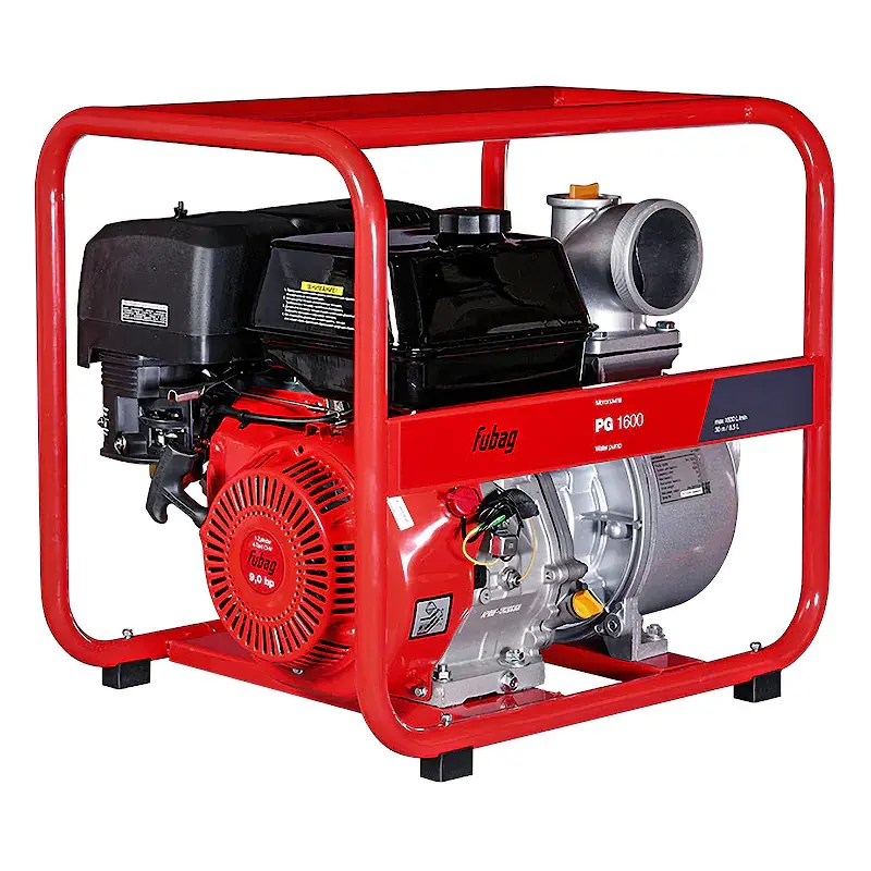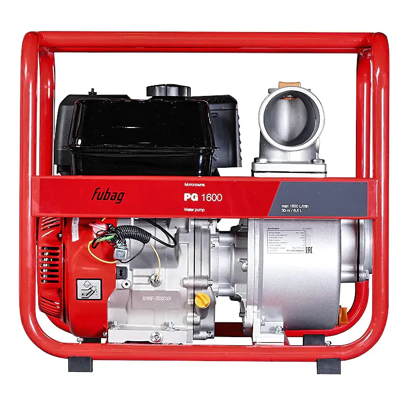Мотопомпа FUBAG PG 1600 имеет прочную стальную раму, которая защищает рабочие узлы от повреждения при перевозке, а также служит удобными ручками для погрузки помпы в транспорт. Широкое основание обеспечивает устойчивость даже на рыхлом грунте. Для защиты двигателя от поломок предусмотрен датчик уровня масла.