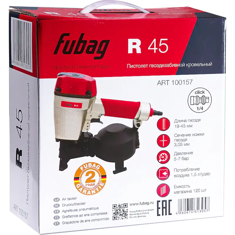 Пистолет кровельный FUBAG R45 имеет компактную эргономичную конструкцию и удобно лежит в руке. Вес устройства составляет 3,2 кг благодаря чему руки долго не устают при работе. Пневматический пистолет безопасен при работе во влажных помещениях, а также гарантирует полную безопасность и защиту от возгорания и электроудара.