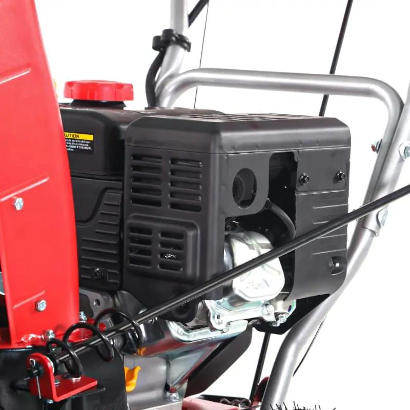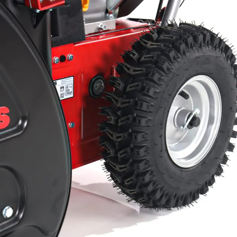 Бензиновый снегоуборщик имеет специальный зимний двигатель, который легко запускается при минусовых температурах. Также он оснащен фарой и электростартером для удобства работы в темное время суток.