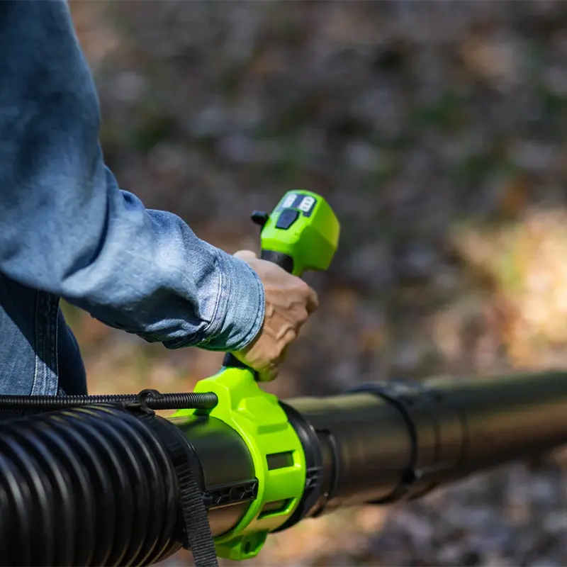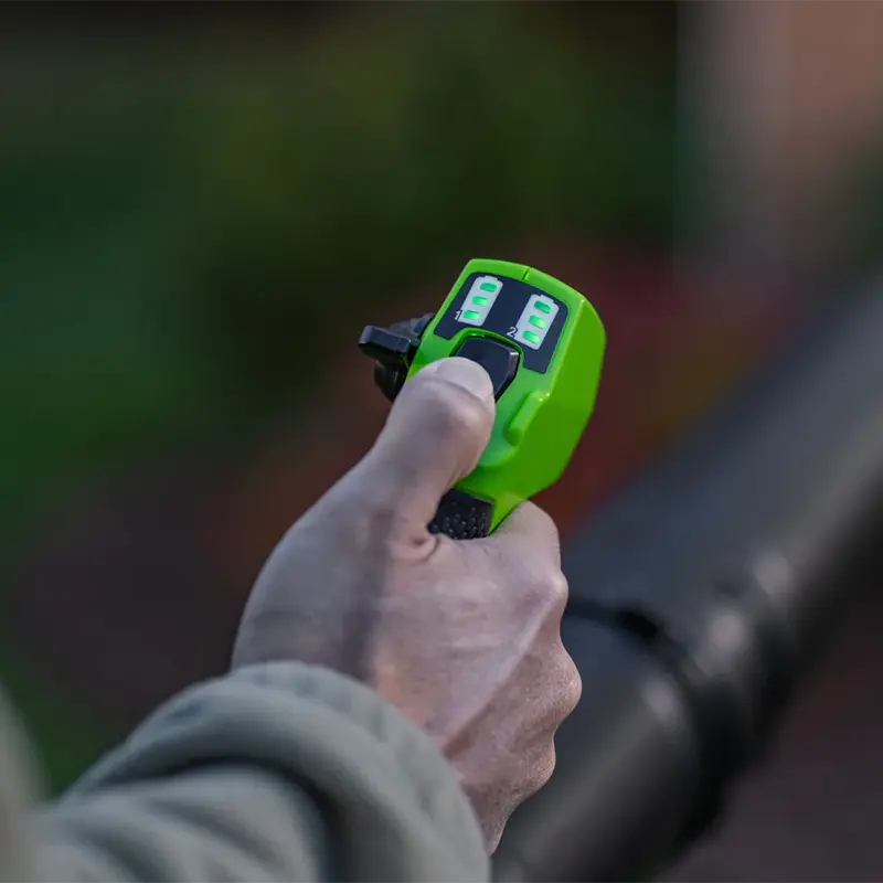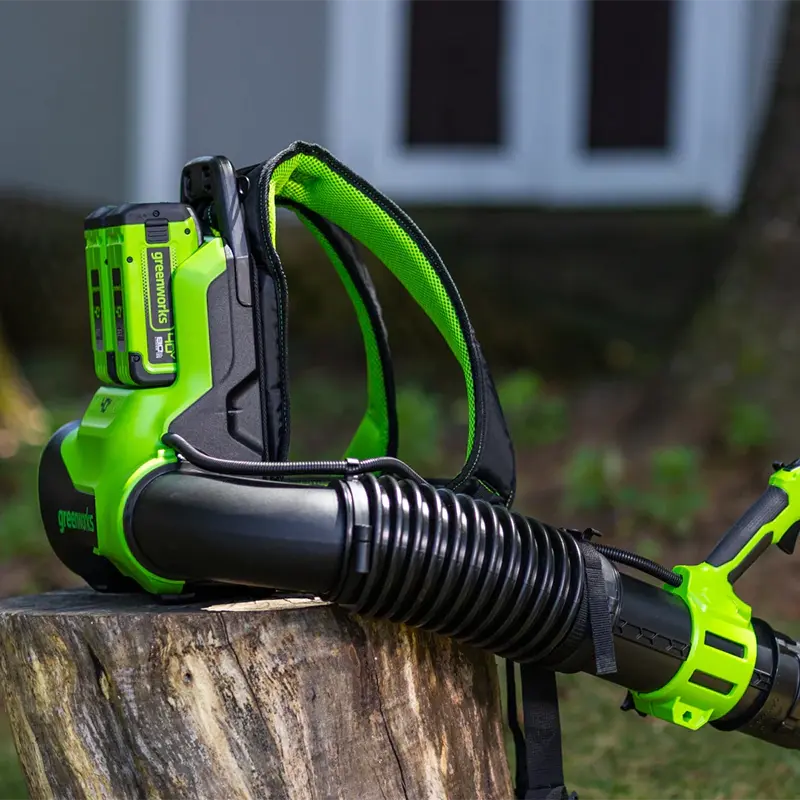 Аккумуляторная ранцевая воздуходувка Greenworks - мощное устройство для уборки придомовой территории и в саду. По скорости и объему воздушного потока соответствует бензиновым устройствам с двигателем 30 см3. Предназначена для сдувания листьев, травы, мусора. Скорость воздушного потока плавно регулируется, круиз контроль фиксирует выбранную скорость. Турбо режим позволяет убирать сильно загрязненную территорию. Высокая производительность обеспечивается бесщеточным двигателем DigiPro™, который не требует обслуживания и работает существенно тише бензинового. Для комфортной продолжительной работы две аккумуляторные батареи размещаются в удобном ранце с широкими мягкими ремнями за спиной оператора. Воздуходувку рекомендуется использовать с батареями емкостью 8Ач и 5Ач. Заряд батарей отображается на индикаторе на ручке устройства.