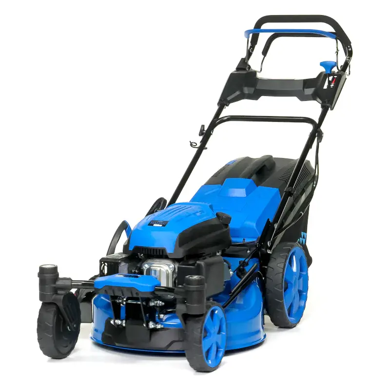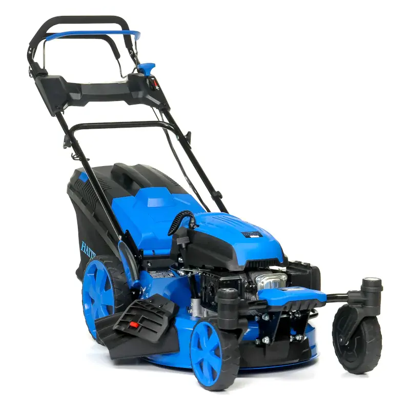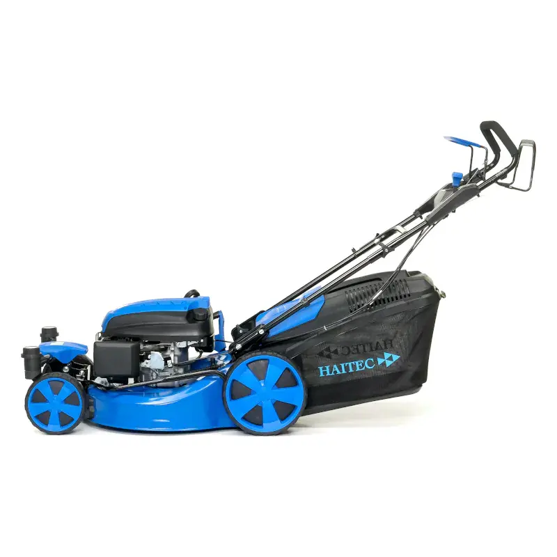 Бензиновая газонокосилка HAITEC с двигателем мощностью 6,5 л.с. рассчитана на уход за участками площадью до 1700 м2. Длина ножа 51 см позволяет скашивать широкую полосу за один проход, что ускоряет обработку территории. Особенность модели – поворотные передние колеса, за счет чего газонокосилку можно развернуть на одном месте, а также проходить узкие участки, косить траву на газонах сложной формы. При необходимости движения по ровной линии колеса можно зафиксировать в прямом положении.