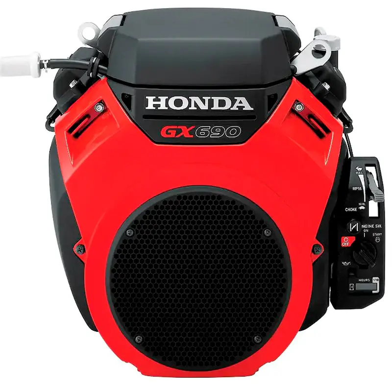 Двигатель бензиновый Honda GX690RH-TXF4 разработан специально для использования совместно с мототехникой. Благодаря специальной конструкции имеет низкий уровень шума и вредных выбросов в атмосферу. Кованый коленчатый вал изготовлен с высокой точностью, что обеспечивает отсутствие вибраций. Оснащен панелью управления, топливным насосом, датчиком уровня масла. Тип двигателя: бензиновый, 4-хтактный, двухцилиндровый, V-образное расположение цилиндров, с воздушным охлаждением и системой газораспределения OHV, без бака и глушителя.