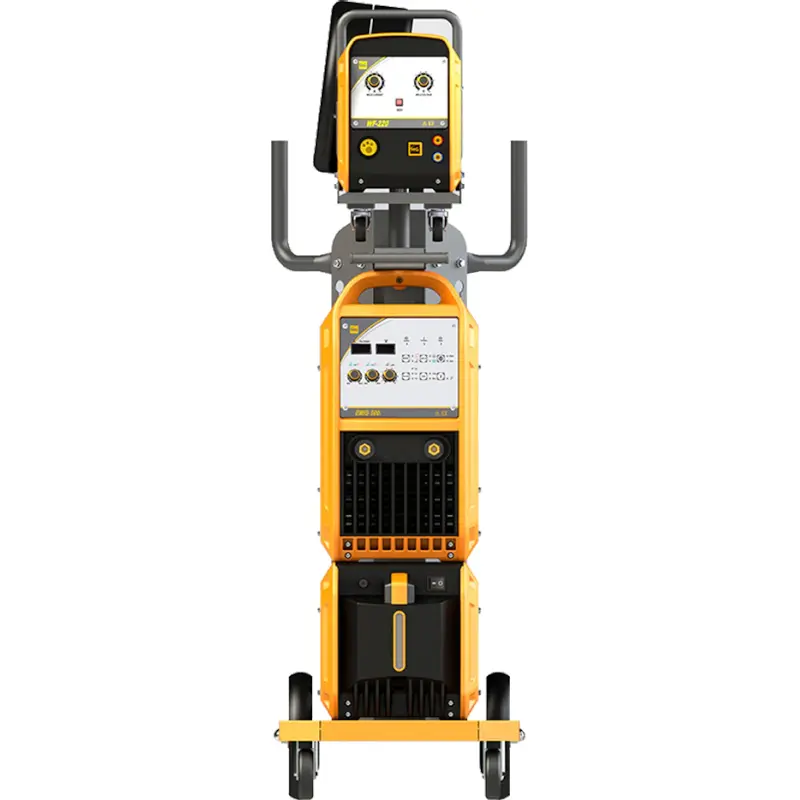 Сварочный полуавтомат Hugong EMIG 500 III – аппарат для работы в режимах MIG/MAG и ММА. Сварочный ток регулируется до максимального показателя 500 А. Модель сделана на базе инверторных транзисторов IGBT. В комплект поставки входят: тележка, система плавной подачи проволоки, блок водяного охлаждения, сварочная горелка HG MIG-501, подающий рукав, кабели, газовый шланг и ролики.