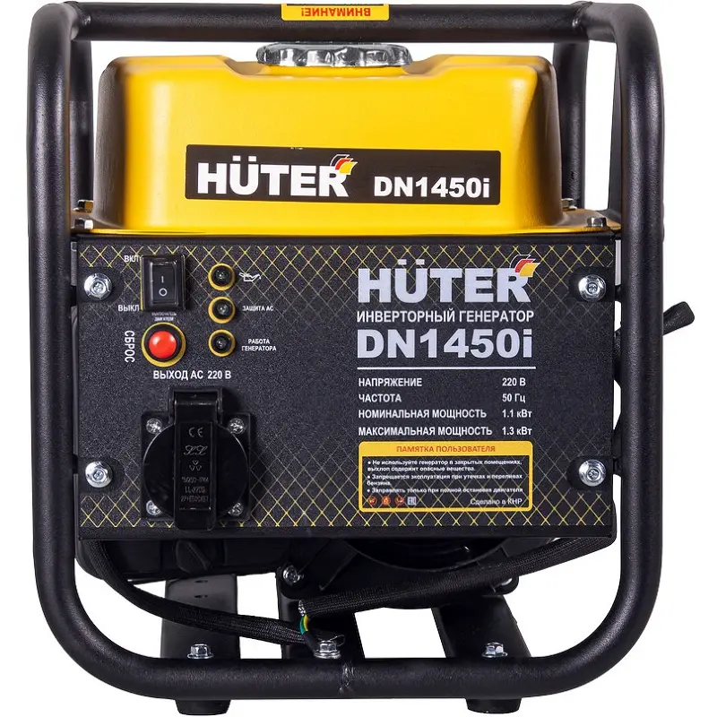 В модели HUTER DN1450i четырехтактный двигатель с воздушным охлаждением и защитой от перегрузки, который вырабатывает мощность 1,1-1,3 кВт.