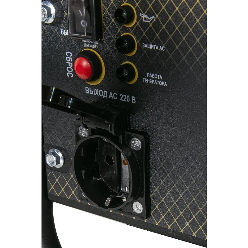 На панели управления расположены выходная розетка, кнопка включения, индикаторы работы и уровня масла. Если оно выработалось полностью, аварийная система остановит двигатель. Для использования подходят моторные масла SAE 10W-40 с API SL, SJ или SF.
