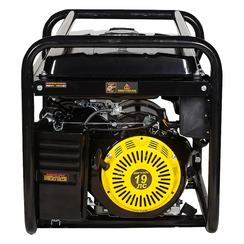 Для подключения потребителей используются три розетки переменного тока 220 В: две бытовые на 16 А и силовая на 32 А. Аналоговый вольтметр наглядно показывает величину подаваемого напряжения. Лампочка индикатора низкого уровня масла сигнализирует о необходимости пополнения смазки.