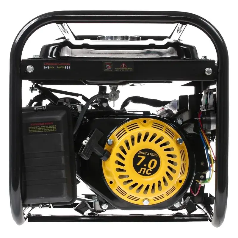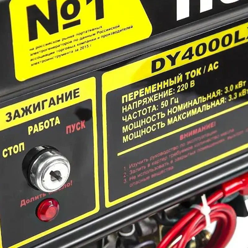 Бензиновый электрогенератор оснащен электростартером, а значит запускается поворотом ключа. Это удобно так как обеспечивает быстрое включение. Сам электростартер расположен в доступном месте, на панели зажигания. При этом разъем под ключ имеет три положения: "стоп", "работа", "пуск".