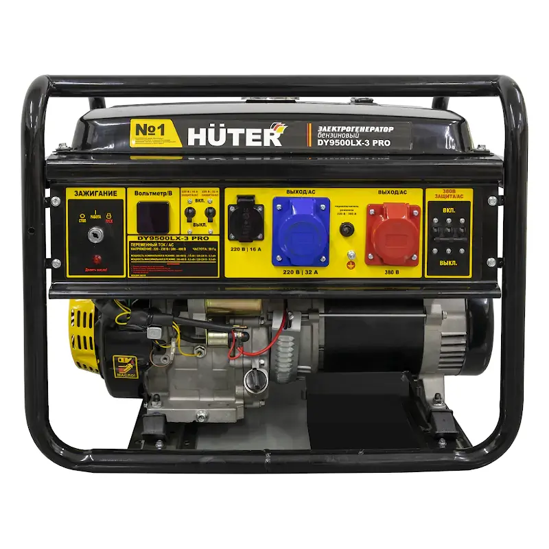 Бензиновый генератор HUTER DY9500LX-3 PRO обеспечивает автономным питанием потребителей однофазного и трехфазного тока при отсутствии центрального электроснабжения или отключении энергии. В режиме 380–400 В устройство позволяет подключить приборы суммарной энергоемкостью до 7500 Вт, в режиме 220–230 В — до 6800 Вт.