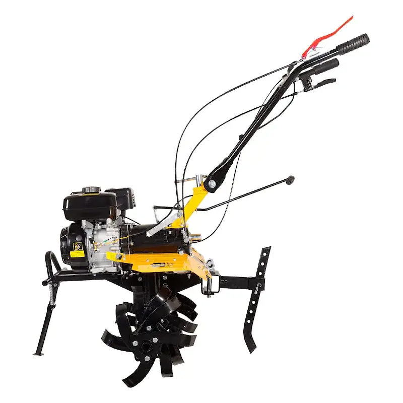 Элементы управления расположены на рукоятках для удобства использования агрегата. Большие колеса с глубоким протектором способствуют хорошей проходимости по любой поверхности. На корпусе предусмотрен щиток, который предотвращает попадание земли на оператора. За счет нескольких скоростей - 3 вперед/ 1 назад можно выбрать оптимальный вариант для обработки почвы.