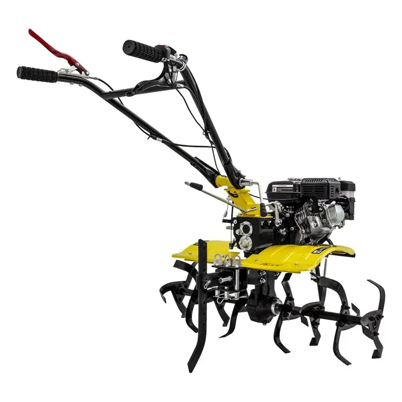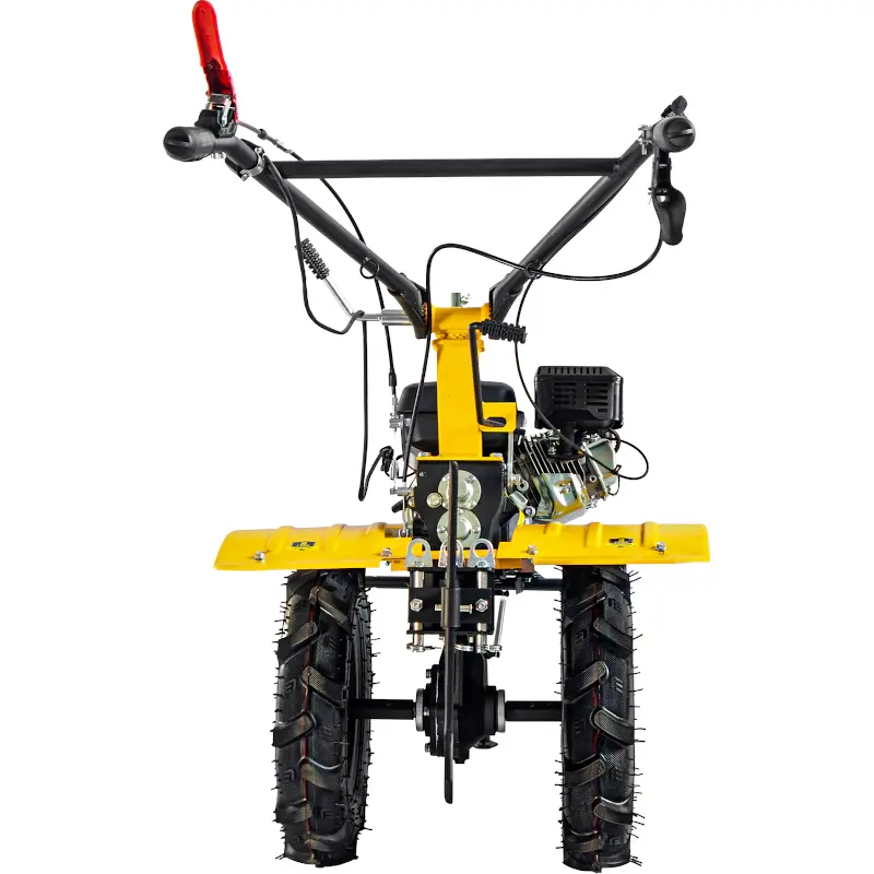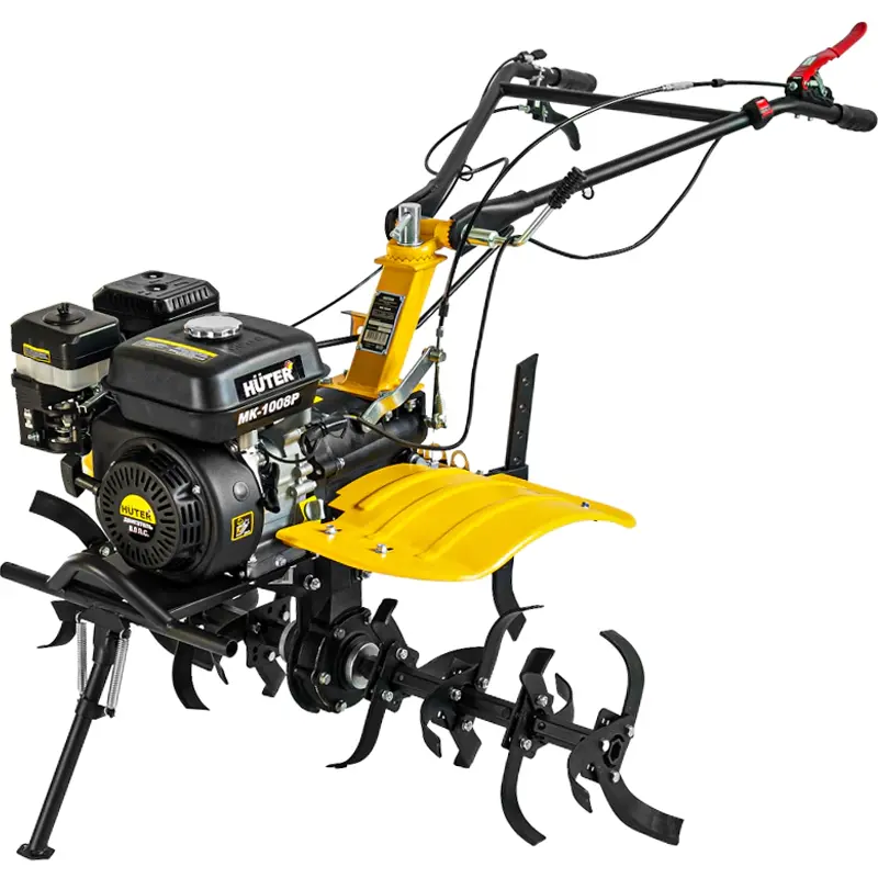 Хорошую проходимость и манёвренность HUTER МК-1008Р обеспечивает наличие трех передач – две вперёд и одна назад, а также широкие резиновые колёса 4х10 с глубоким, агрессивным протектором. Всё это позволяет мотокультиватору уверенно продвигаться по влажной земле и рыхлому грунту. Машина имеет удобную систему управления с переключателями на ручках агрегата. Защита пользователя обеспечена специальным щитком.