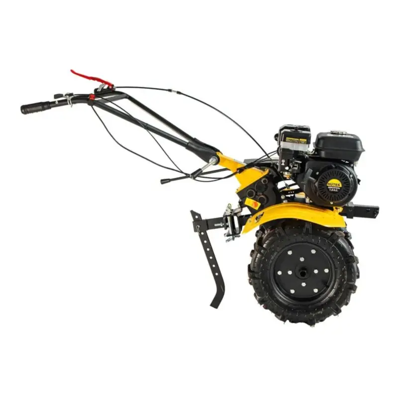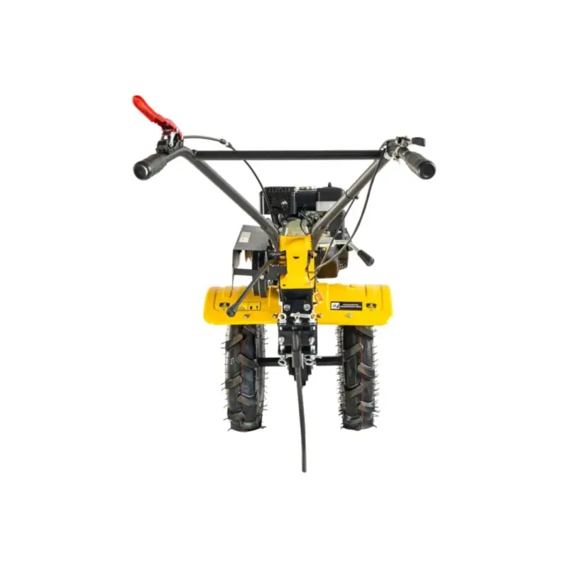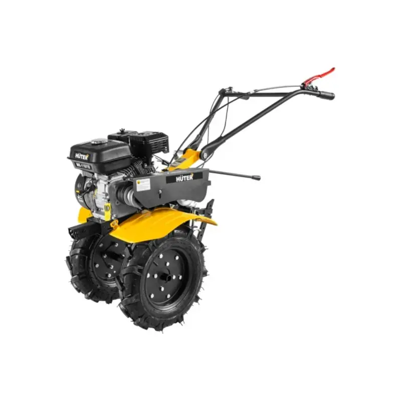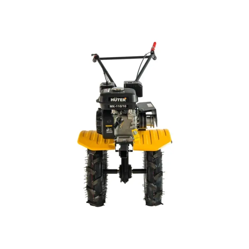 Особое внимание уделено удобству перемещения и безопасности оператора. Широкие колёса размера 4x10 дюймов оснащены агрессивным протектором, предотвращающим застревание машины в мягких почвах. Защитные крылья помогают избежать раскидывания почвы в сторону оператора во время обработки территории.