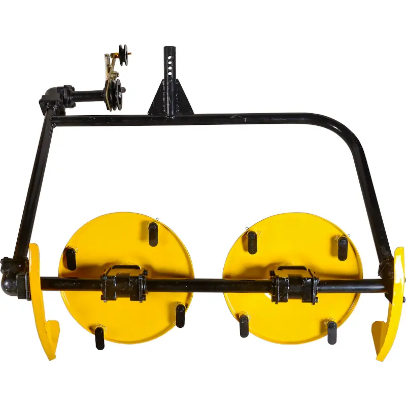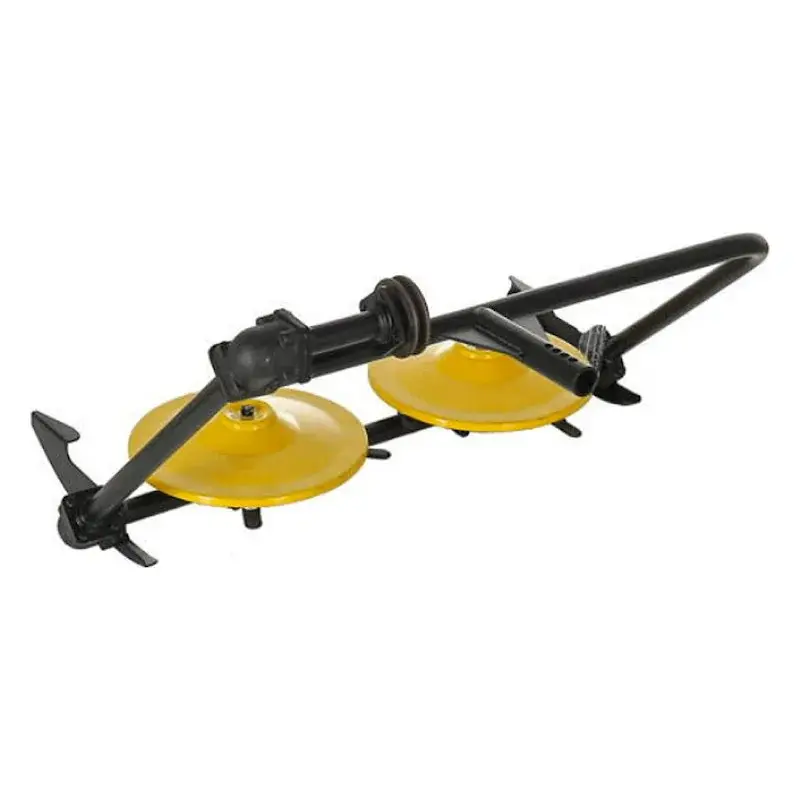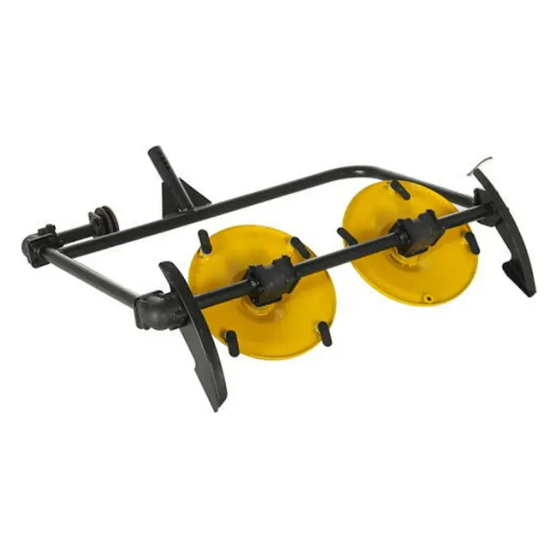 Косилка состоит из рамы, на которой зафиксированы два диска с острозаточенными ножами, сбоку рамы располагаются салазки, за счет которых можно отрегулировать высоту среза. Имеет небольшой вес, проста в установке, что обеспечивает комфортное использование.