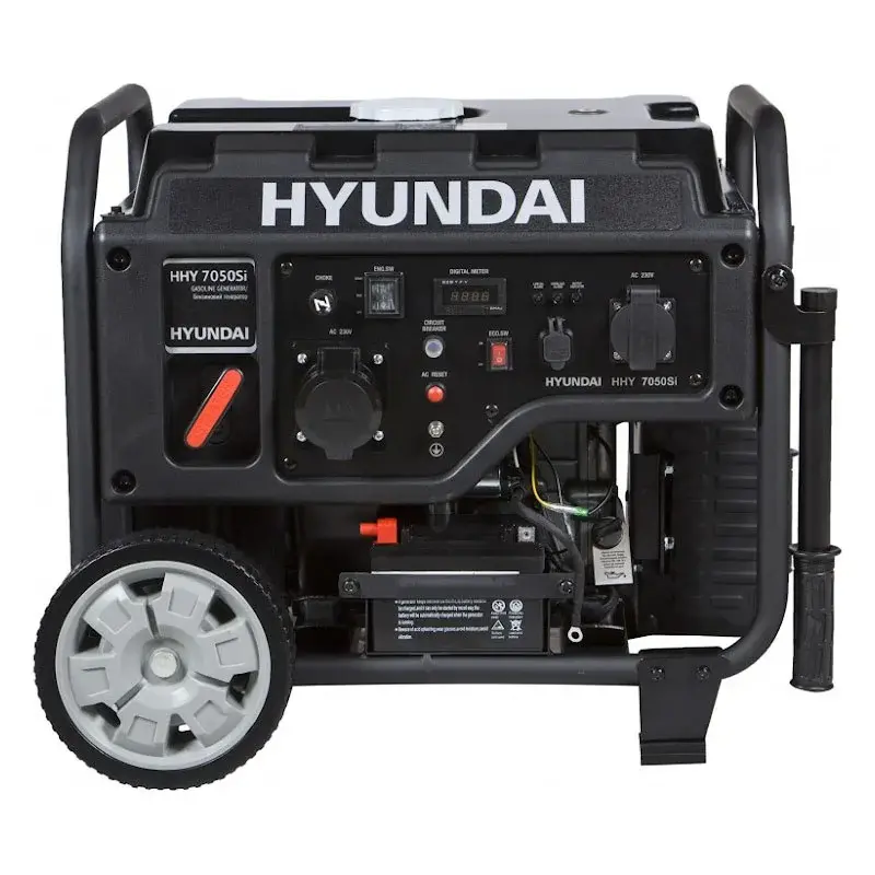 Инверторный генератор Hyundai HHY 7050Si номинальной мощностью 5 кВт вырабатывает качественный ток со стабильной синусоидой, что позволяет использовать его в качестве резервной электростанции для загородного дома, питания котлов отопления и высокоточных приборов. Устройство оснащено четырехтактным бензиновым двигателем мощностью 9,5 л.с., вместительным топливным баком и колесами для перевозки. Температура эксплуатации: от -5°С до +35°С.