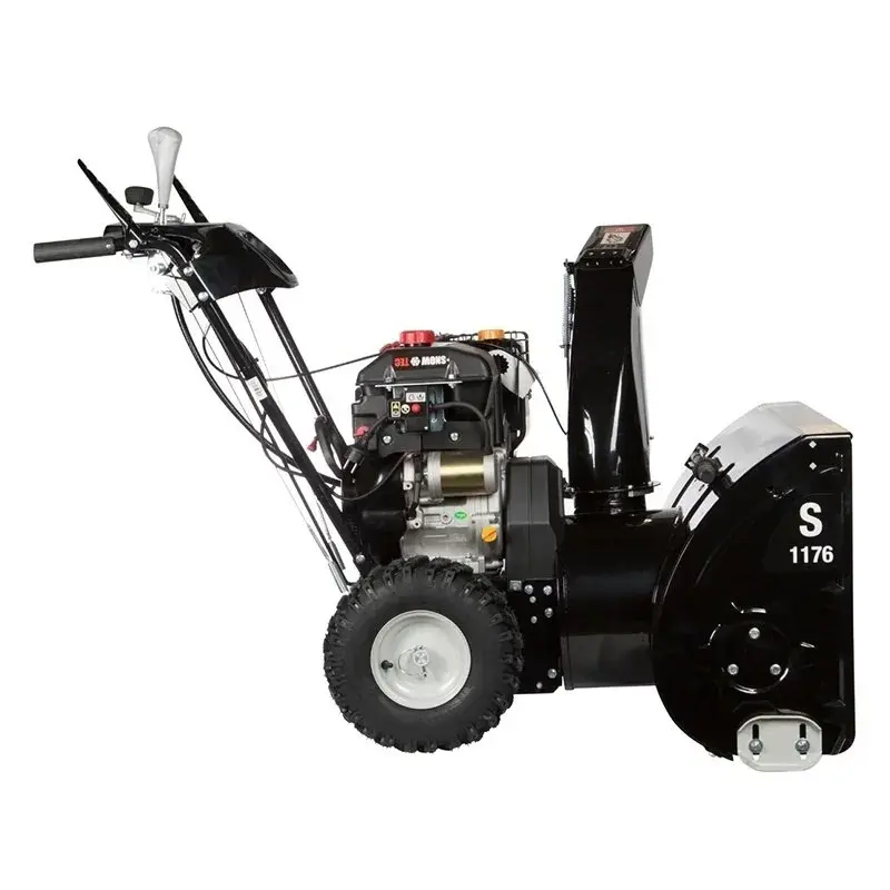 Ширина уборки снега за один проход – 76 см, высота – 51 см. Удобная система управления позволяет настраивать скорость движения инструмента, а также направление и дальность выброса. Заборный ковш из двухмиллиметровой стали оснащен ножом для снятия остаточного слоя снега и лыжами для лучшего скольжения.