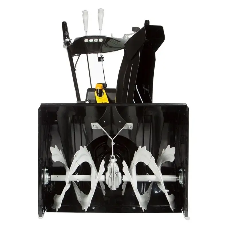 В снегоуборщике предусмотрен как ручной запуск, так и электрический. Во втором случае понадобится подключиться к розетке на 230 В и взять на себя управление дроссельной заслонкой - повернув её до положения “CHOKE”. Данный способ подходит при запуске холодного двигателя. Помимо этого, для более простого включения двигателя есть подогрев карбюратора, что препятствует обледенению.
