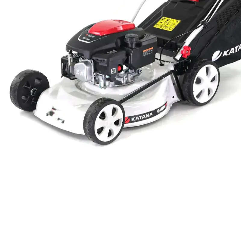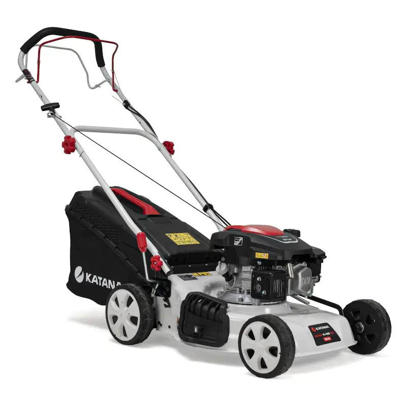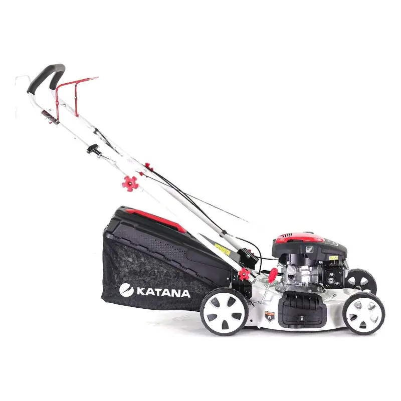 Бензиновая газонокосилка KATANA KL-46BS PRO работает с травосборником, мульчирующей заглушкой или желобом для бокового выброса срезанных растений. Ширина скашивания составляет 46 см. Для максимально простого использования имеет привод на задние колеса.