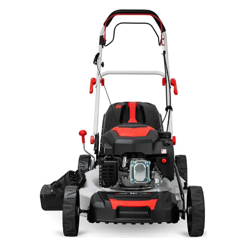 Бензиновая газонокосилка поддерживает несколько режимов работы. Скошенная трава либо собирается в травосборник, либо выбрасывается обратно на газон через боковой или задний разгрузочный лоток, либо мульчируется для удобрения почвы. Семиуровневая регулировка высоты кошения выполняется при помощи рычага около заднего колеса. Косилка движется самостоятельно с постоянной скоростью. Достаточно лишь задать направление. В труднопроходимых местах привод можно отключить, отпустив соответствующий прижимной рычаг. На рукоятке предусмотрен специальный держатель для шнура стартера, избавляющий от необходимости наклоняться вперед при запуске двигателя.