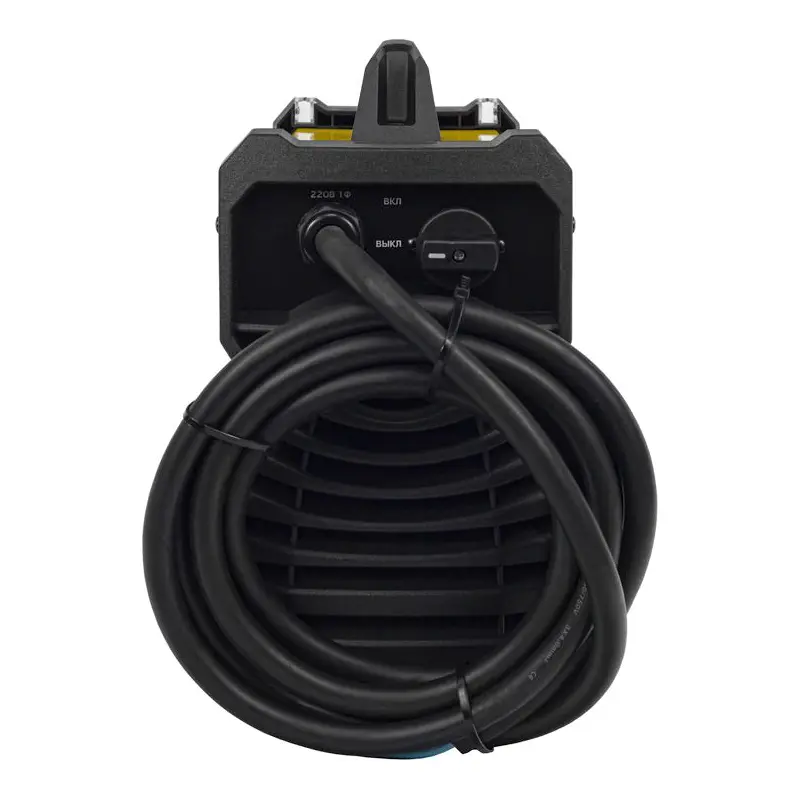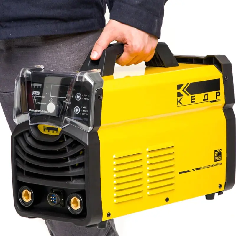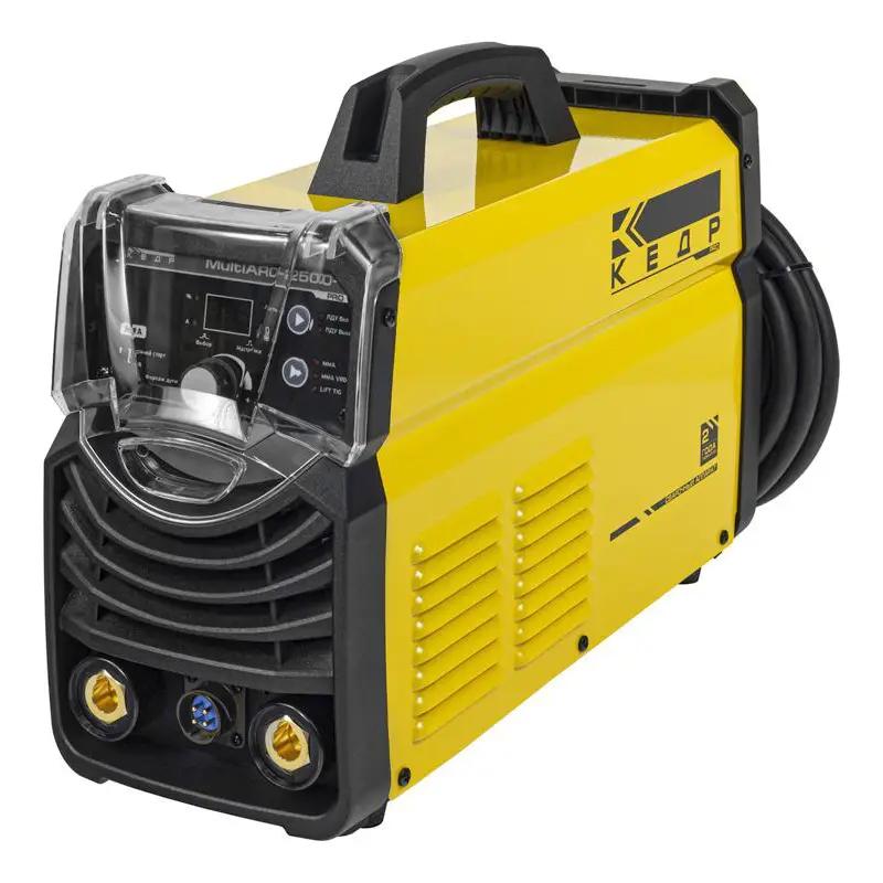 Передняя панель управления закрыта прозрачным пластиковым экраном с целью защиты от пыли и случайных ударов. Компактный и легкий сварочный аппарат КЕДР MultiARC 2500 1 удобно переносить между рабочими объектами за прочную верхнюю ручку.