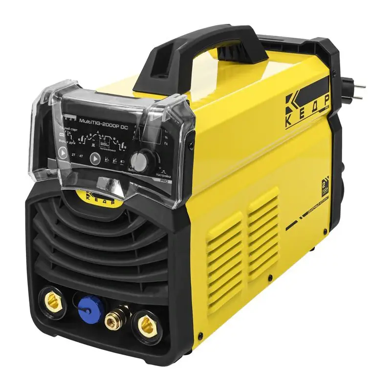 Панель управления закрыта прозрачным пластиковым экраном для защиты от пыли и случайных ударов. В случае отключения питания параметры последней сварки автоматически сохраняются в памяти и восстанавливаются при следующем включении. К устройству можно подключить педаль и пульт дистанционного управления. Благодаря небольшому компактному корпусу сварочный аппарат КЕДР MultiTIG 2000P DC удобно переносить между рабочими объектами за верхнюю ручку.