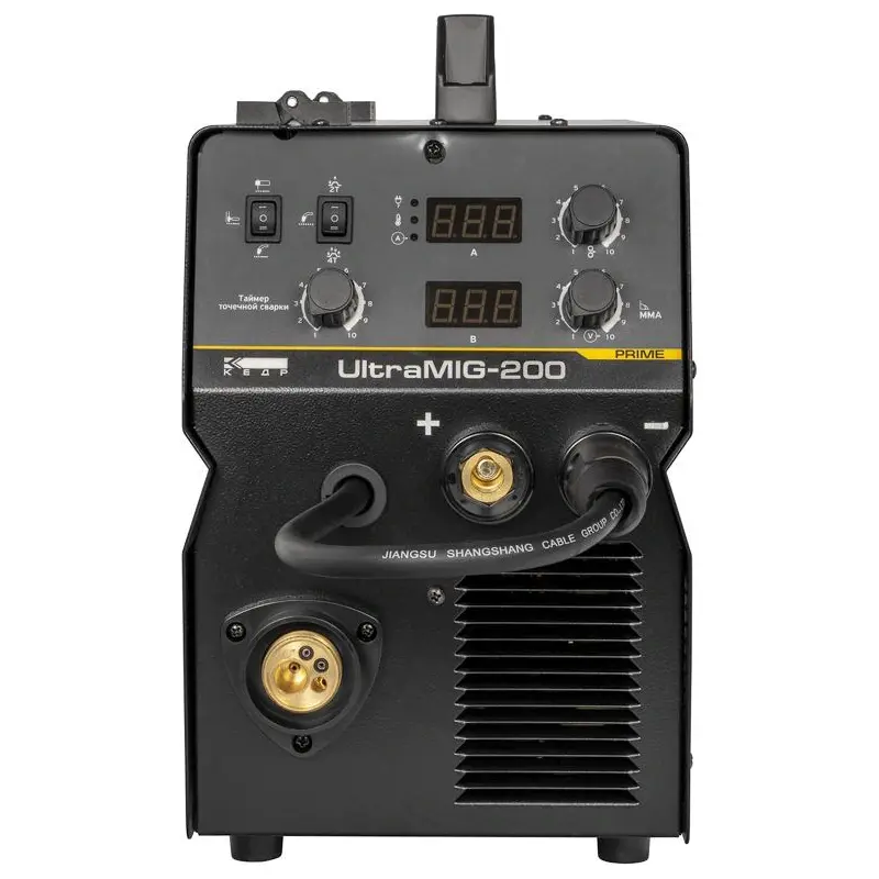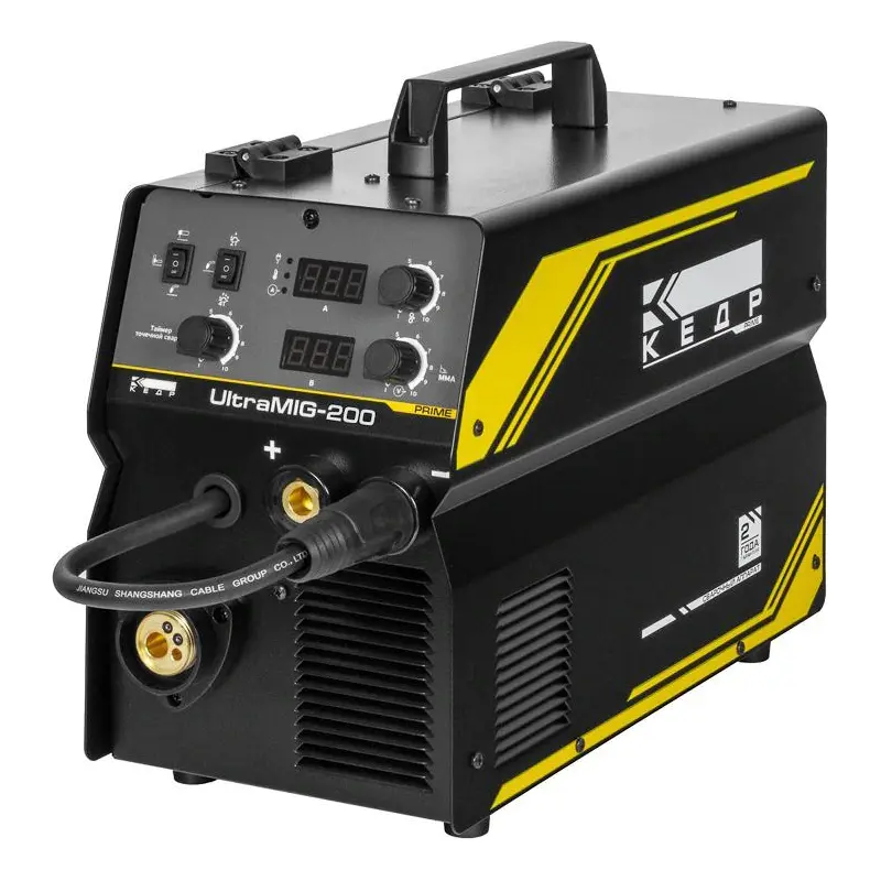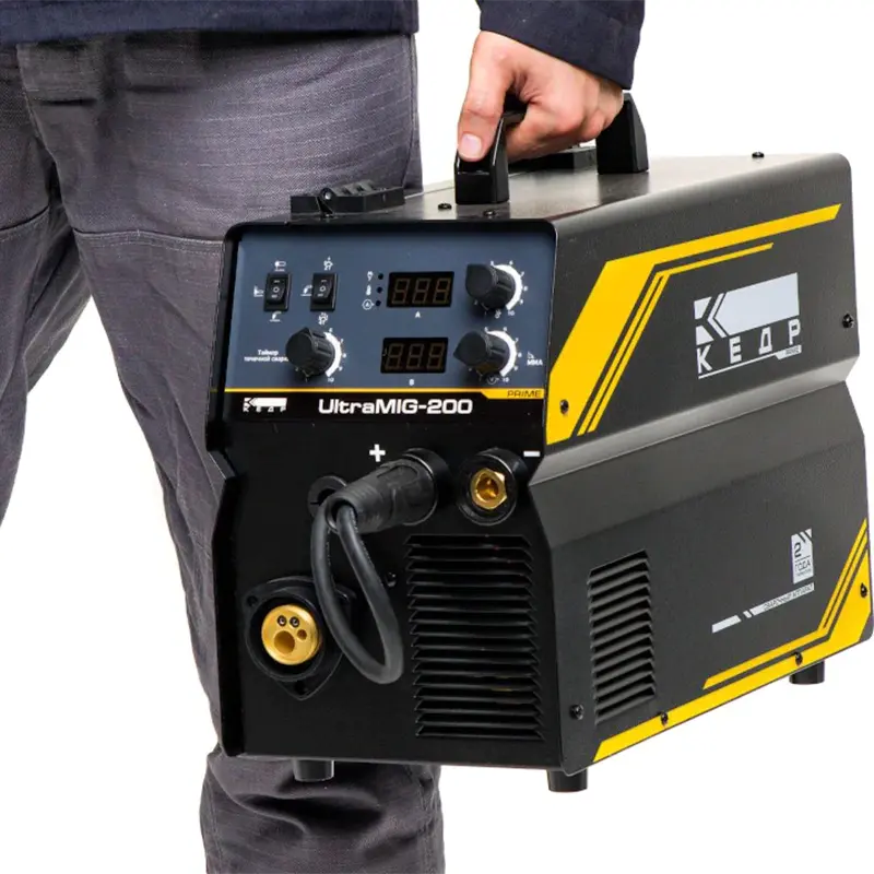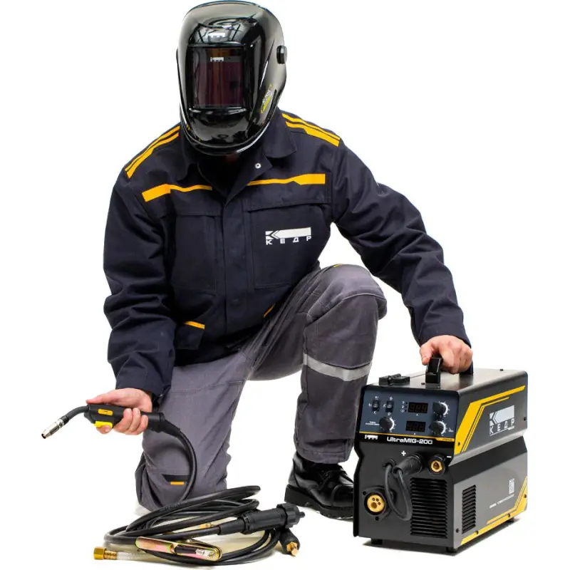Сварочный полуавтомат КЕДР UltraMIG 200 подходит для сварки на малых предприятиях, в ремонтных цехах, автосервисах, частных гаражах и мастерских. Аппарат применяется для сварки углеродистой и низколегированной стали ручным или полуавтоматическим методом. Вы можете варить проволокой диаметром 0,6–1 мм, подающейся с катушки, в среде защитного газа или штучными электродами. Инверторный аппарат имеет защиту от перегрузки и систему воздушного охлаждения. Установка мощностью 5,6 кВт подключается к бытовой розетке однофазной сети.