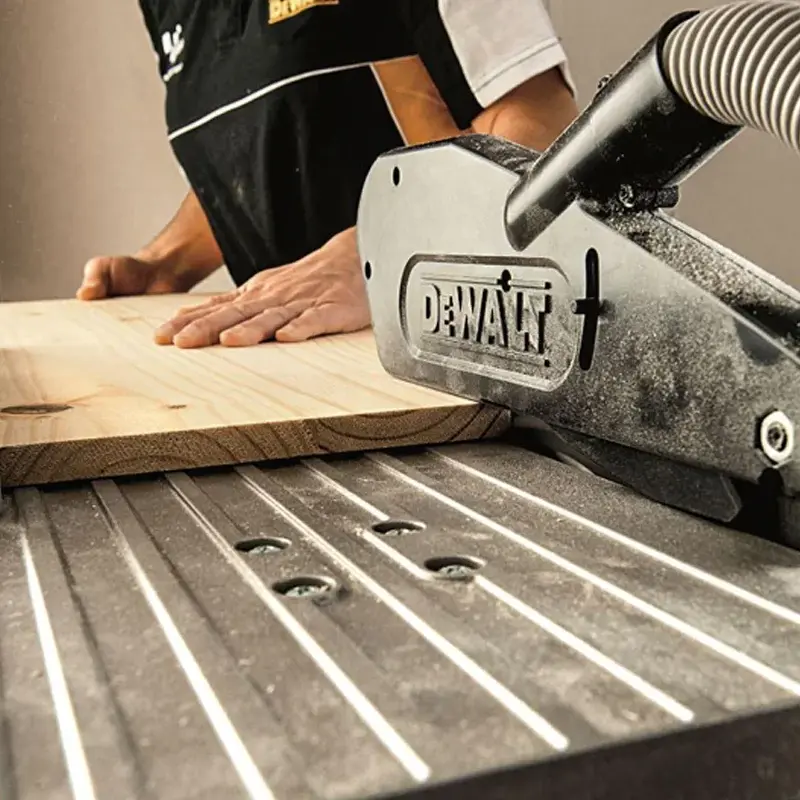 Торцовочная пила DeWALT D27113 весит всего 19,5 кг. За счет этого его легко переносить по рабочему помещению. Для удобства на корпусе размещены выступы для рук.