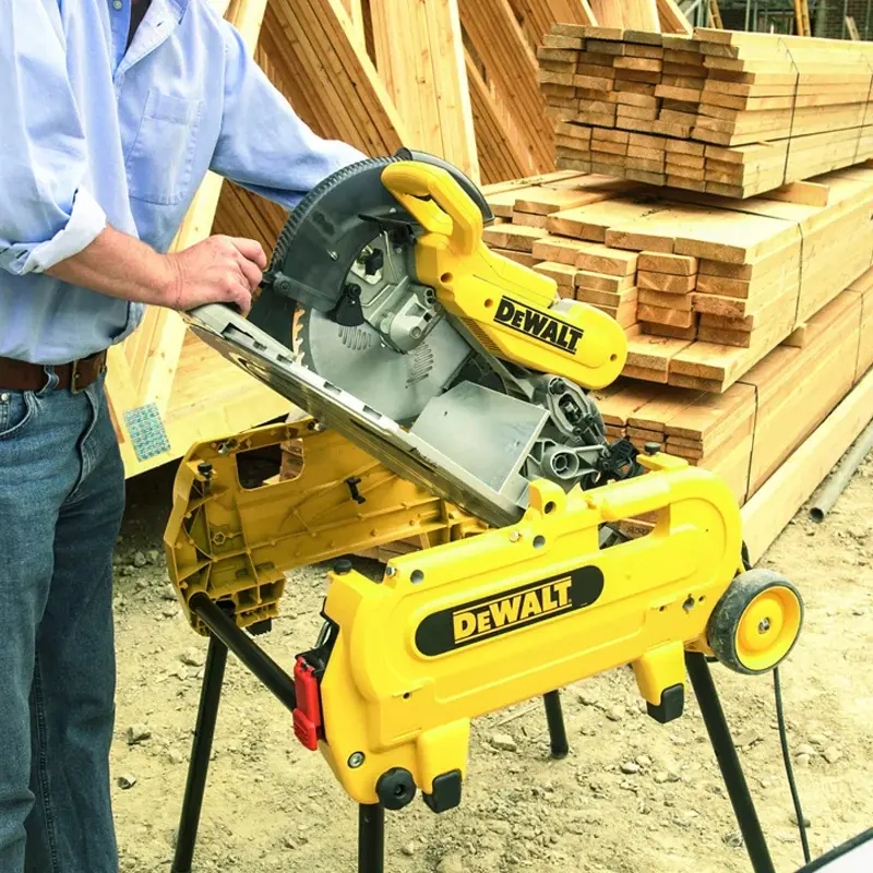 Ножки торцовочной пилы DeWALT D27107 отсоединяются, а верхняя часть с режущей головкой компактно складывается. В таком виде инструмент не займет много пространства во время хранения. А за счет двух транспортировочным колес и длинной рукоятки вы можете с легкостью перемещать модель по рабочему помещению.