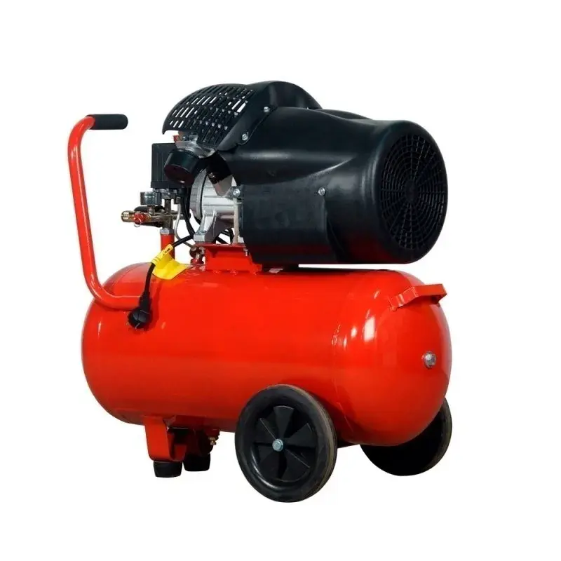 Двухцилиндровый поршневой масляный компрессор оснащен электродвигателем мощностью 2200 Вт с частотой вращения 2850 об/мин. Устройство тепловой защиты отключает мотор в случае перегрузки. Ресивер объемом 50 л изготовлен из листового металла на роботизированной сварочной линии, отличается надежностью и безопасностью, имеет два ревизионных отверстия и клапан слива конденсата.
