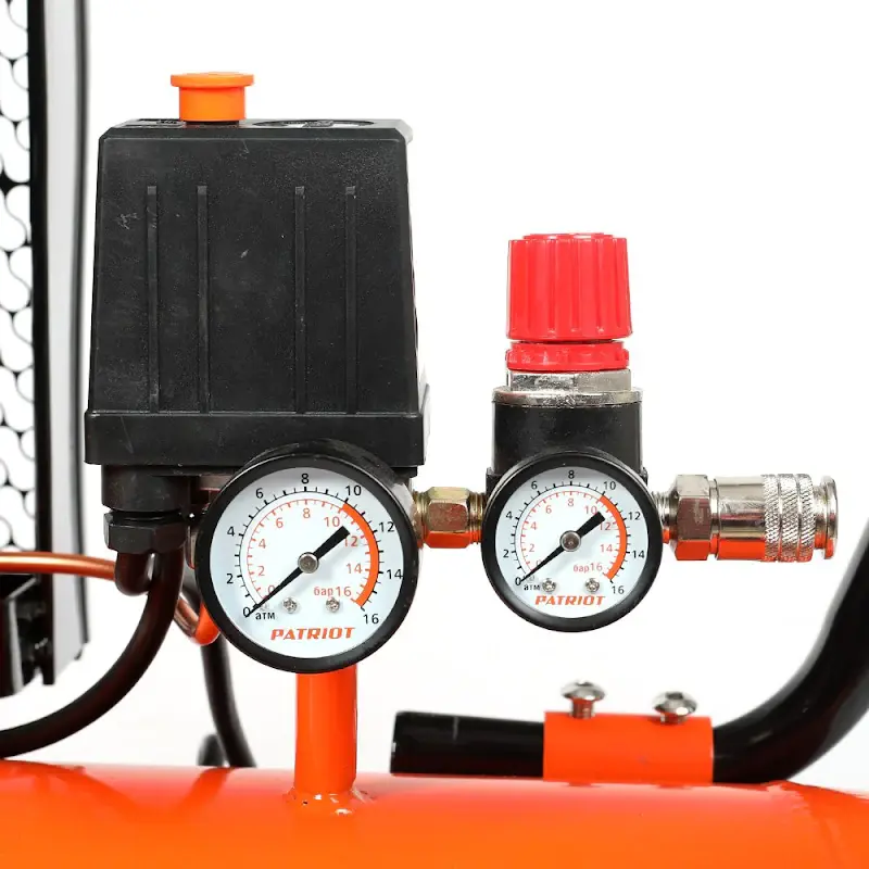 Прессостат автоматически отключает двигатель при давлении в ресивере 10 бар. При расходовании воздуха пневмоинструментом давление снижается и прессостат включает двигатель. Вы можете регулировать давление на выходе в диапазоне от 1 до 10 бар в зависимости от подсоединенного инструмента. Рабочие параметры удобно отслеживать с помощью двух манометров.