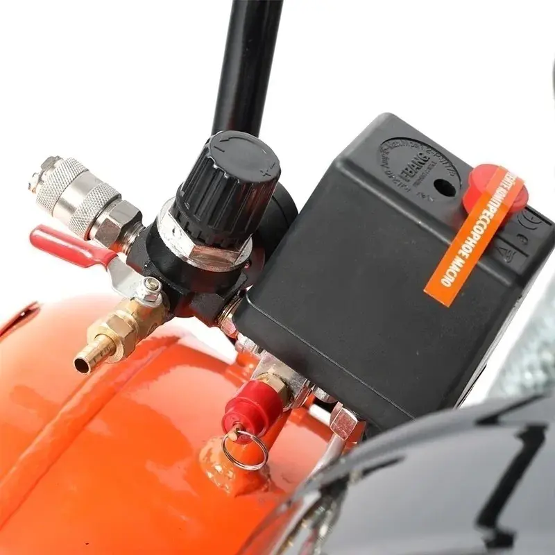 После запуска двигателя реле давления автоматически поддерживает работу компрессора, включая и отключая подкачку воздуха. Полный бак компрессора набирается чуть более чем за 2 минуты. Во избежание аварийных ситуаций при отказе прессостата давление стравливается через предохранительный клапан. Два манометра позволяют контролировать давление в ресивере и на выходе. Давление на выходе можно изменить поворотным регулятором.