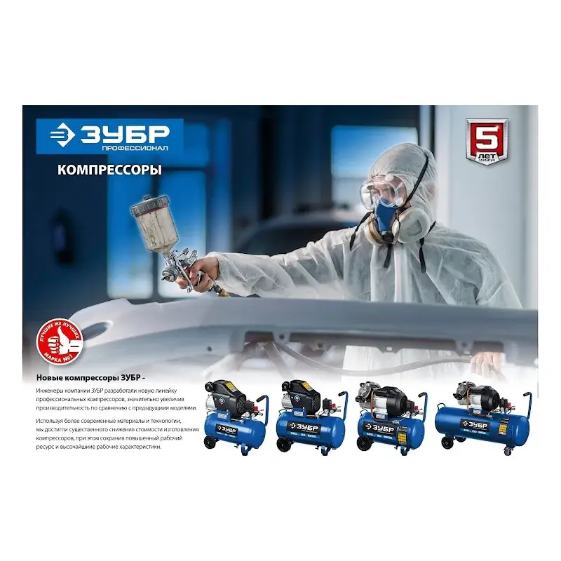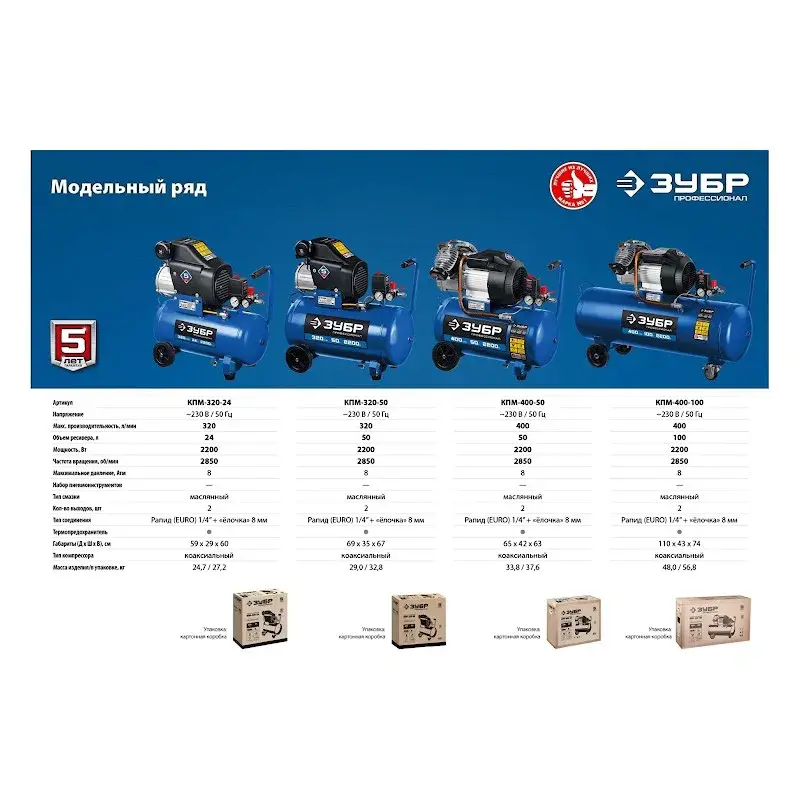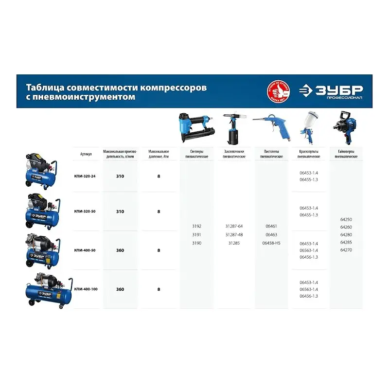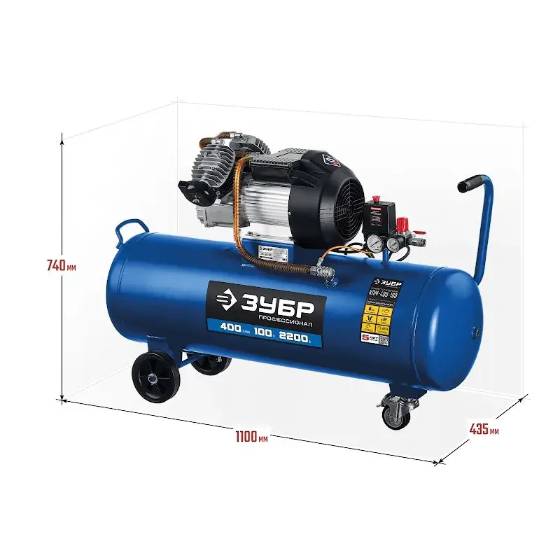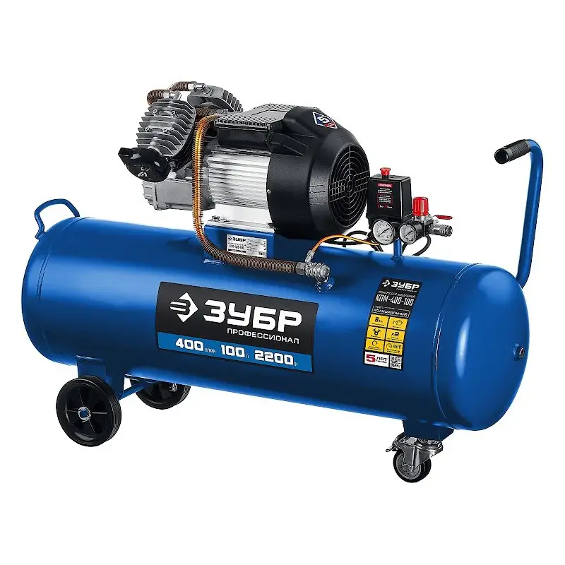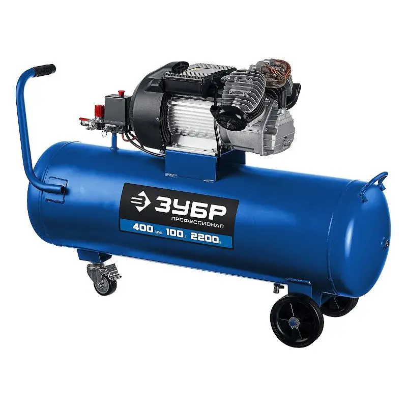 Компрессор воздушный ЗУБР КПМ-400-100 обладает максимальной производительностью 400 л/мин и позволяет подключать до 2 инструментов сразу. Объем ресивера на 100 л гарантирует продолжительное использование без дозаправки.