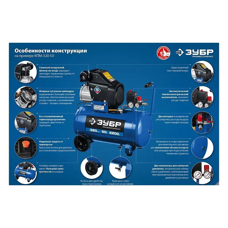 Термопредохранитель исключает перегрев внутренних элементов, своевременно отключая аппарат. Для оптимального отвода тепла в компрессорной установке ЗУБР КПМ-400-100 предусмотрена рифленая магистраль.