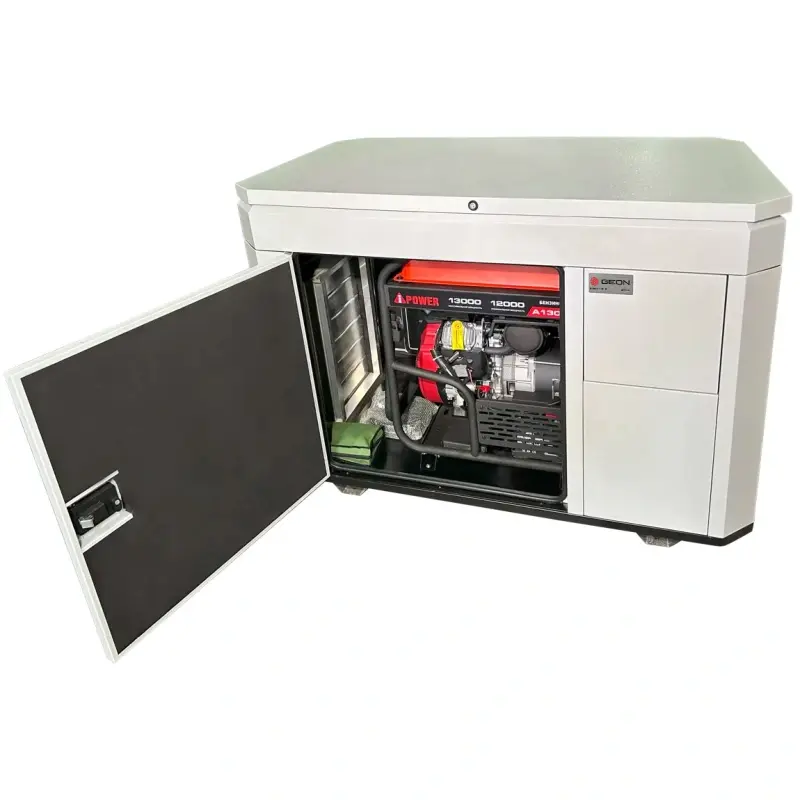 Данный кожух предназначен для круглогодичного использования генераторов до 20 кВт. Супертихая комплектация, усиливающая шумоизолирующие свойства кожуха за счет уникальной конструкции корпуса и тихими центробежными вентиляторами и дополнительным глушителем шума. Кроме того, кожух 1600 обеспечивает утепление генератора благодаря электрическому конвектору. Зимой в кожухе для электростанции постоянно поддерживается плюсовая температура, что гарантирует запуск генератора даже в сильный мороз.