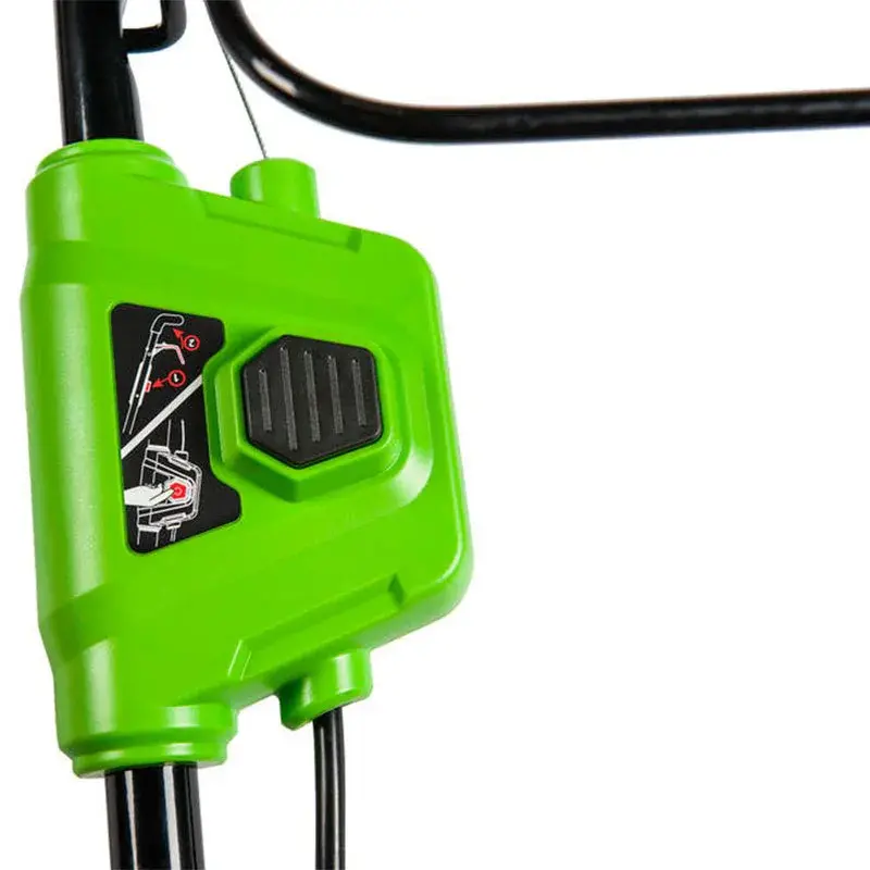 Рукоятка складная и регулируемая по высоте. Клавиша питания и пусковой рычаг находятся в верхней части держателя. Это облегчает управление инструментом.