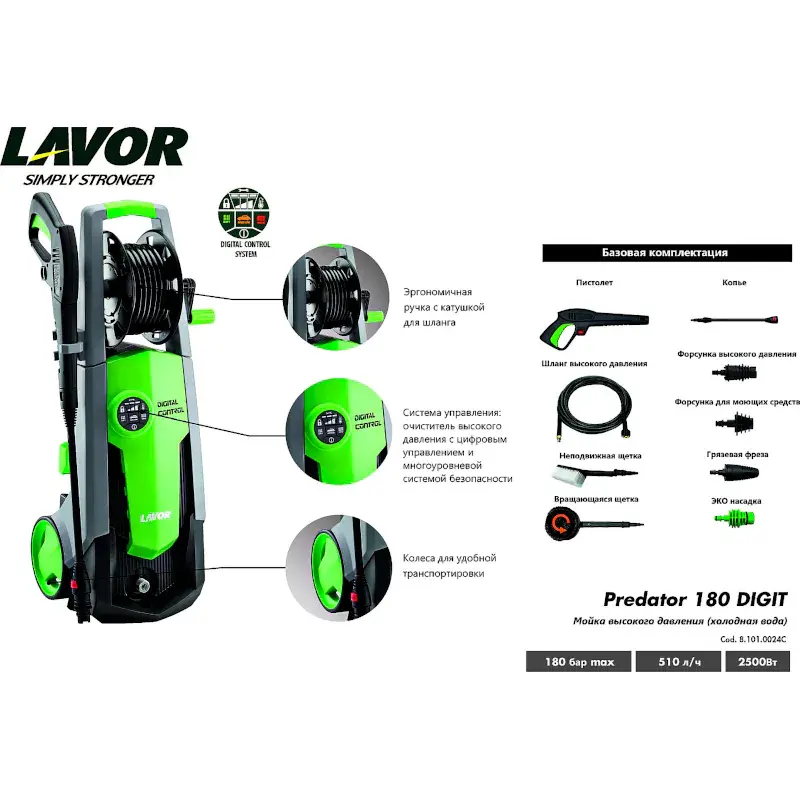 Электрическая минимойка LAVOR Predator 180 Digit имеет несколько различных насадок в комплекте, масимальное давление составляет 180 бар. Длинный штанг на катушке дает возможность пользователю свободно перемещаться вокруг аппарата, если этого требуют условия уборки.