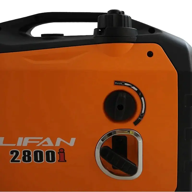 Двигатель запускается посредством ручного стартера. Регулировка воздушной заслонки осуществляется через поворотный переключатель. Чтобы завести двигатель, нужно повернуть ручку и потянуть за пусковой трос. На передней панели находится бытовая розетка на 220 В для подключения потребителей и выход постоянного тока на 12 В для подзарядки аккумуляторов. Инверторный генератор LIFAN автоматически выключается в случае подсоединения избыточной нагрузки, превышающей 2,4 кВт.