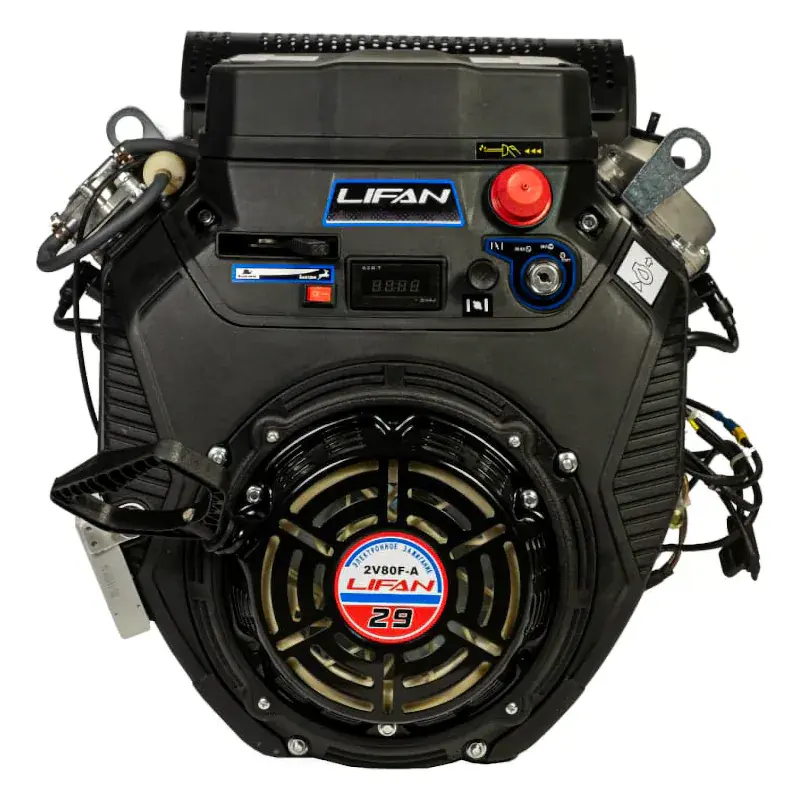 Двигатель LIFAN LF2V80F-A, 29 л.с. D25, 20А разработан специально для использования совместно с картингами, вездеходами, мотобуксировщиками, минитракторами, снегоходами, багги. Тип двигателя: бензиновый, 4-хтактный, двухцилиндровый, с воздушным охлаждением. Оснащен датчиком давления масла, маслянным радиатором, счетчиком моточасов. Степень сжатия: 8.5 : 1. Вращение вала против часовой стрелки.