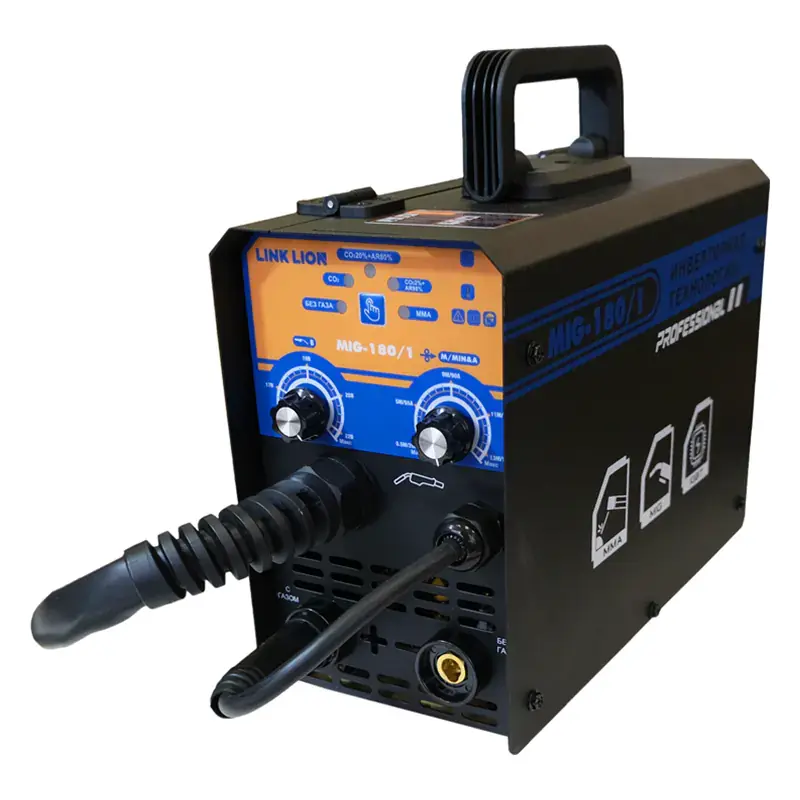 Сварочный аппарат LINK LION MIG-180 позволяет использовать режим полуавтоматической сварки в бытовых условиях — на даче, в гараже, домашней мастерской, а также подходит для профессиональной сварки на стройке или небольшом предприятии. Компактное портативное устройство с наплечным ремнем удобно переносить. Сварочный ток можно плавно регулировать в диапазоне от 20 до 160 А в зависимости от толщины свариваемого материала. Инверторная технология обеспечивает стабильные выходные показатели тока даже при пониженном напряжении 190 В.