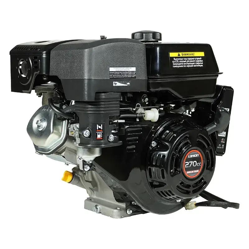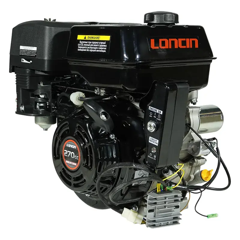 Одноцилиндровый двигатель, объем 270 куб.см, 9 л.с, горизонтальный вал 25 мм, ручной и электрический запуск, катушка освещения 5 Ампер.