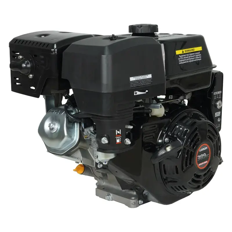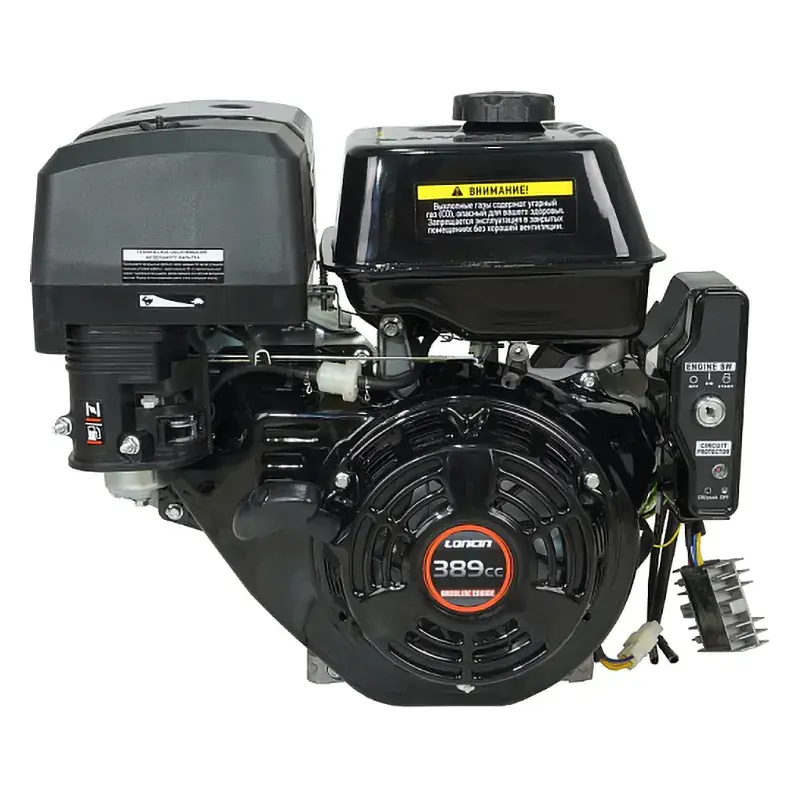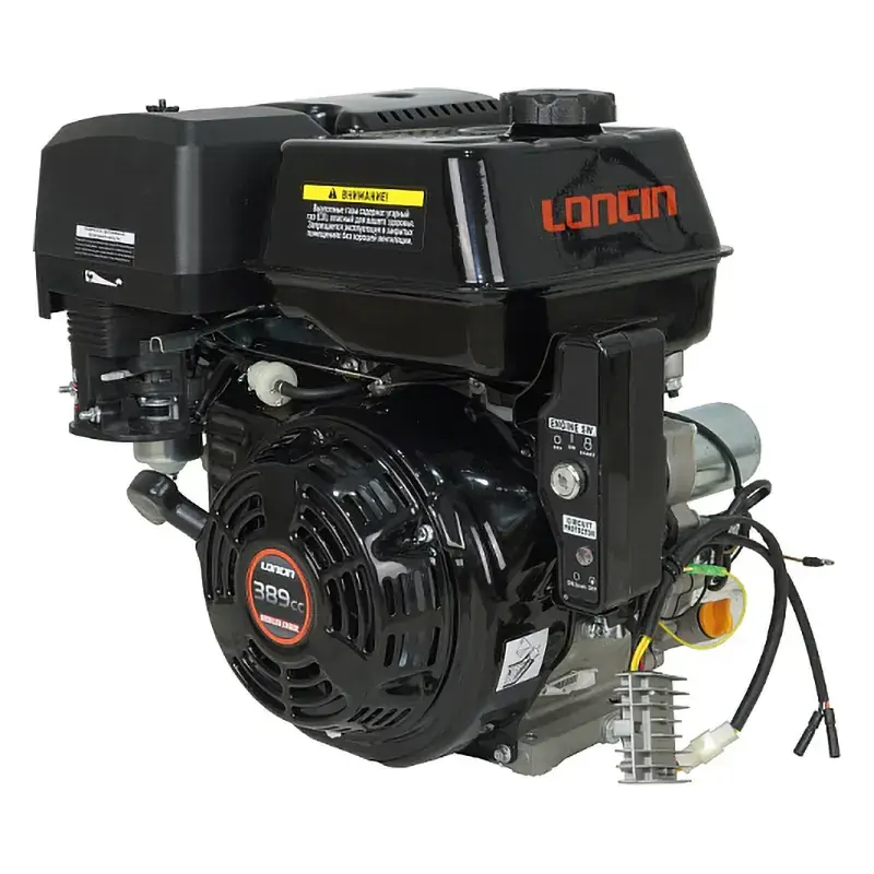 Одноцилиндровый двигатель, объем 389 куб.см, 13 л.с, горизонтальный вал 25 мм, ручной и электрический запуск, катушка освещения 5 Ампер.