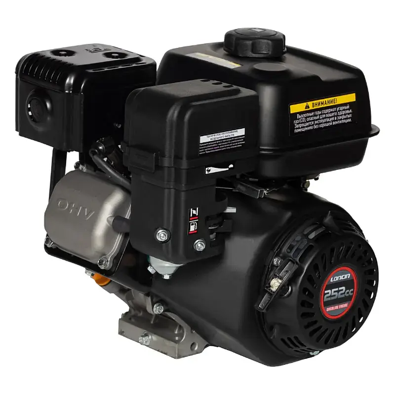 Одноцилиндровый двигатель, объем 252 куб.см, 8.5 л.с, горизонтальный вал 25 мм, ручной запуск, катушка освещения 5А.