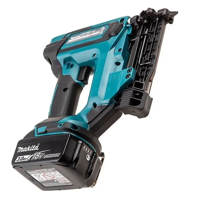 Рычаг блокиратора фиксирует ударный механизм. Функция предотвращает случайное срабатывание гвоздезабивного пистолета Makita DPT353RFE, что актуально при транспортировке.