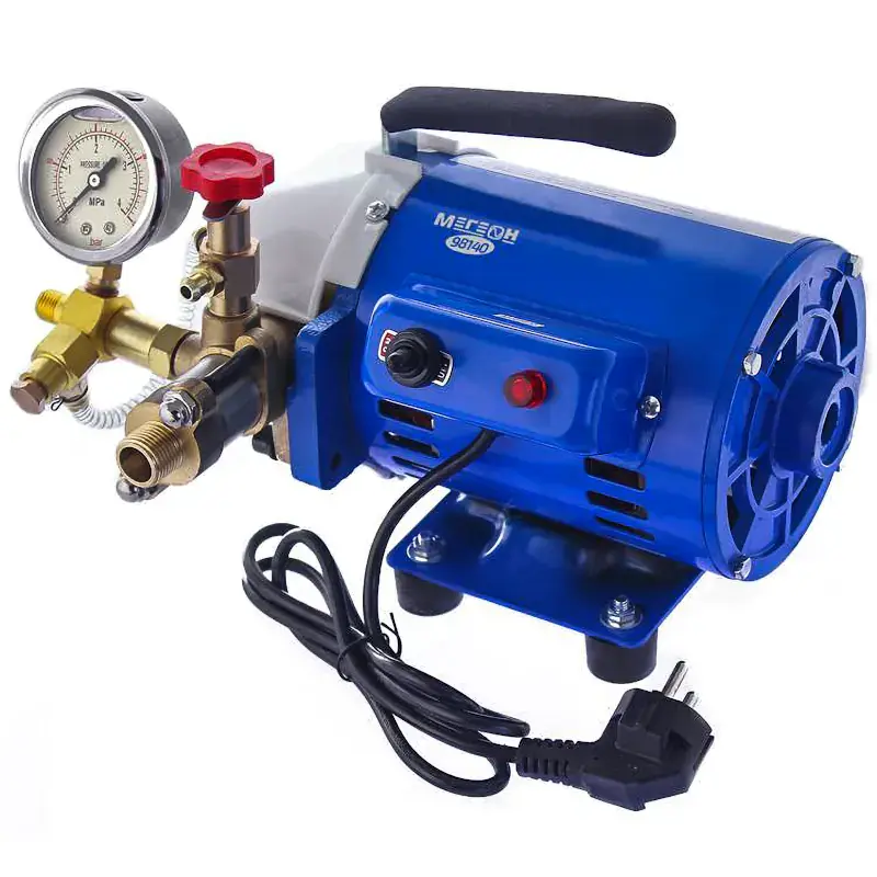 Электрический опрессовочный насос МЕГЕОН 98140 помогает проводить гидравлические испытания на герметичность систем водоснабжения, отопления, канализации и пожаротушения, паровых котлов, других трубопроводов и прочего технологического оборудования. Предельное нагнетаемое давление составляет 4 МПа. Состояние испытываемого контура удобно отслеживать по встроенному манометру с аналоговой шкалой. Пластиковый резервуар для жидкости не подвержен коррозии. В комплект поставки входят три шланга, переходник, уплотнения и фильтр грубой очистки. Устройство работает от бытовой сети с напряжением 220 В. Опрессовщик отличается низким уровнем шума во время работы.