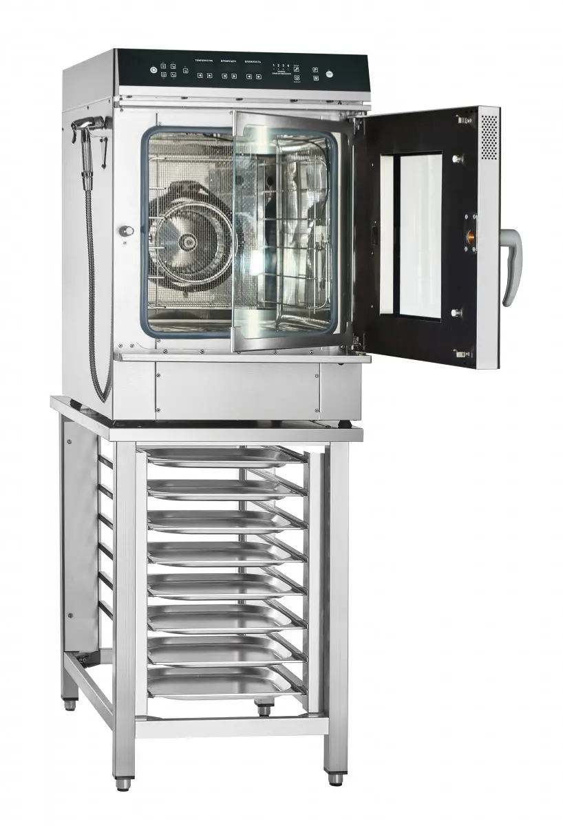 Мини-модель ПКА 6-2/3П-01 занимает совсем немного места на кухне. Ее можно использовать как стационарно, так и для выездных мероприятий. Управление простое и наглядное — есть панель с поддержкой русского языка. Дверцу можно закрыть легким толчком, что особенно удобно, когда у повара заняты руки.