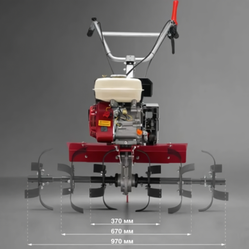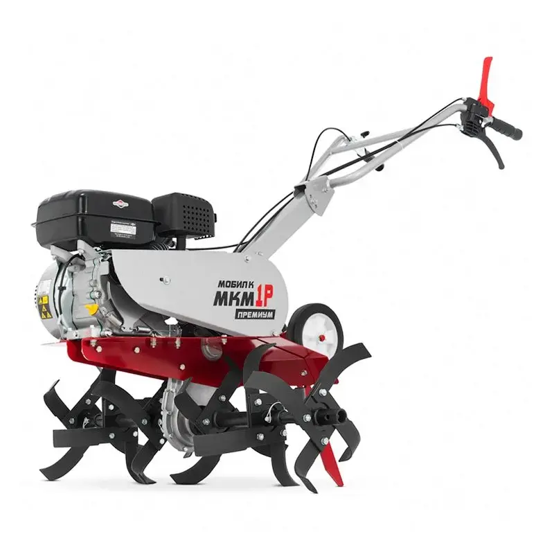 Мотокультиватор Мобил К МКМ-1Р ПРЕМИУМ оснащен 4-тактным мотором Honda GP200 мощностью 6,5 л.с. Модель совместима с докупаемым навесным оборудованием и способна выполнять до 7 разнообразных задач: от вспашки целины до удаления сорняков.