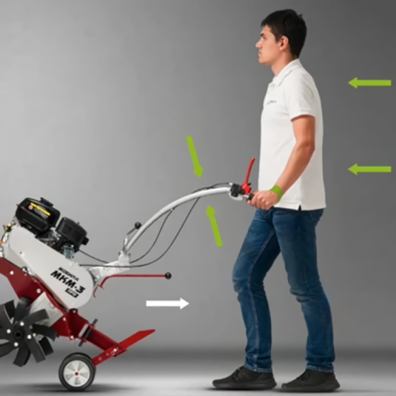 Технология Ease Ride Wheel объединяет сошник и транспортировочные колеса одной конструкцией. Если вы опускаете ручку на себя, то фрезы поднимаются вверх. Это удобно т.к. в таком положении мотоблоку не будет царапать ножами декоративные дорожки.