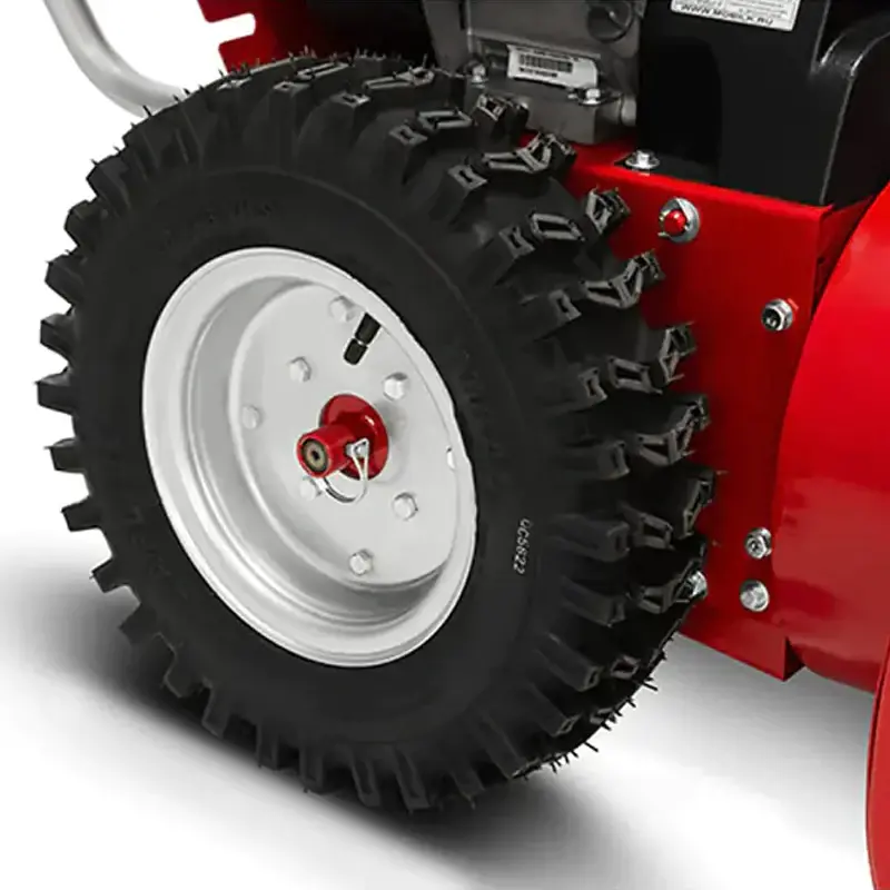 Шестеренчатая трансмиссия обеспечивает широкий выбор скоростей движения — пять передних передач и две задние. На пониженной передаче удобно выполнять уборку мокрого снега или расчищать территорию с неровной поверхностью. Колесные протекторы с глубоким рельефом обеспечивают отличное сцепление с дорогой при любой погоде, даже в гололедицу.
