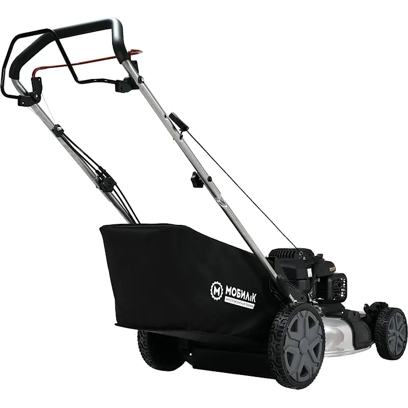 Самоходный тип перемещения газонокосилки Мобил К XM561 Про значительно облегчает стрижку травы. Вам не понадобится толкать технику по участку. Это облегчает маневрирование и разворот модели. Скорость движения составляет 3,4 км/ч. Вам понадобится только задавать направление при помощи рукоятки. Колеса оснащены подшипниками для плавного хода. Для лучшей проходимости задние колеса больше передних.
